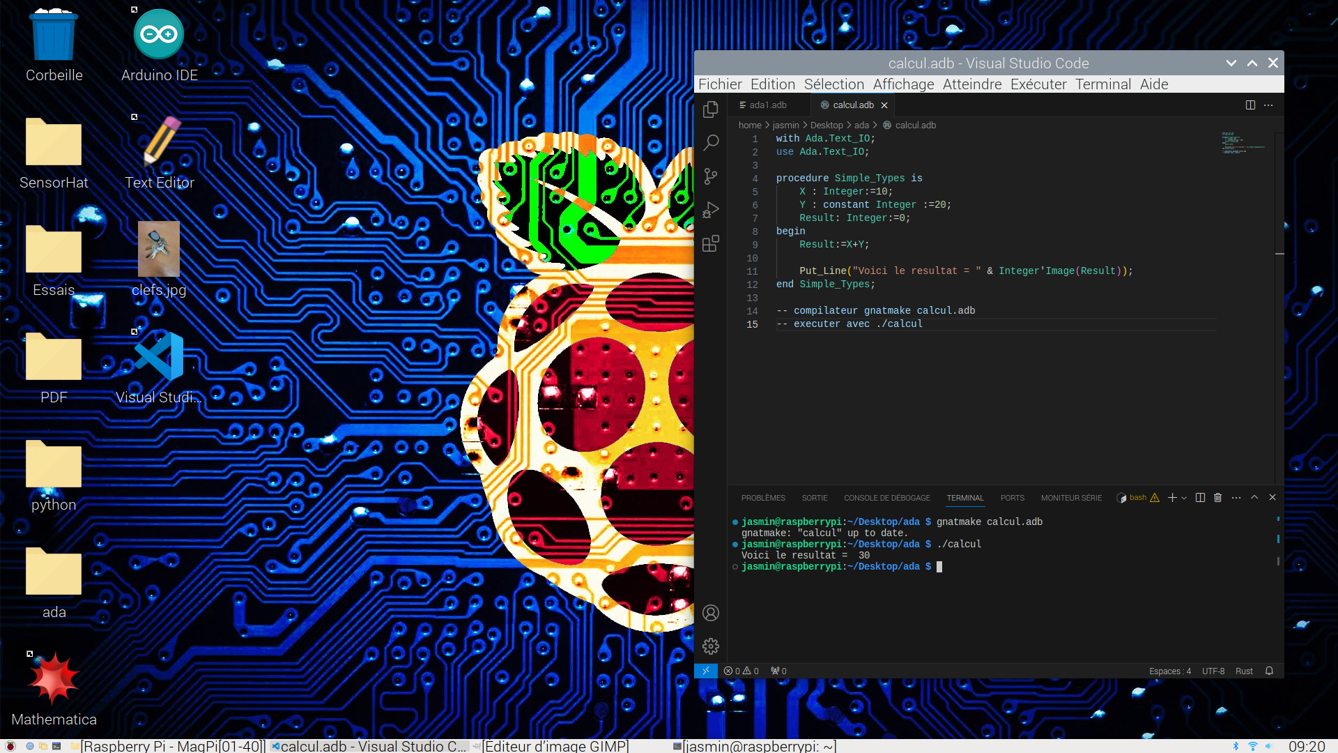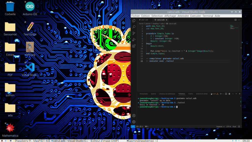 gnatmake calcul.adb en mode terminal sur Linux du Raspberry 400 programmé avec Visual Code.