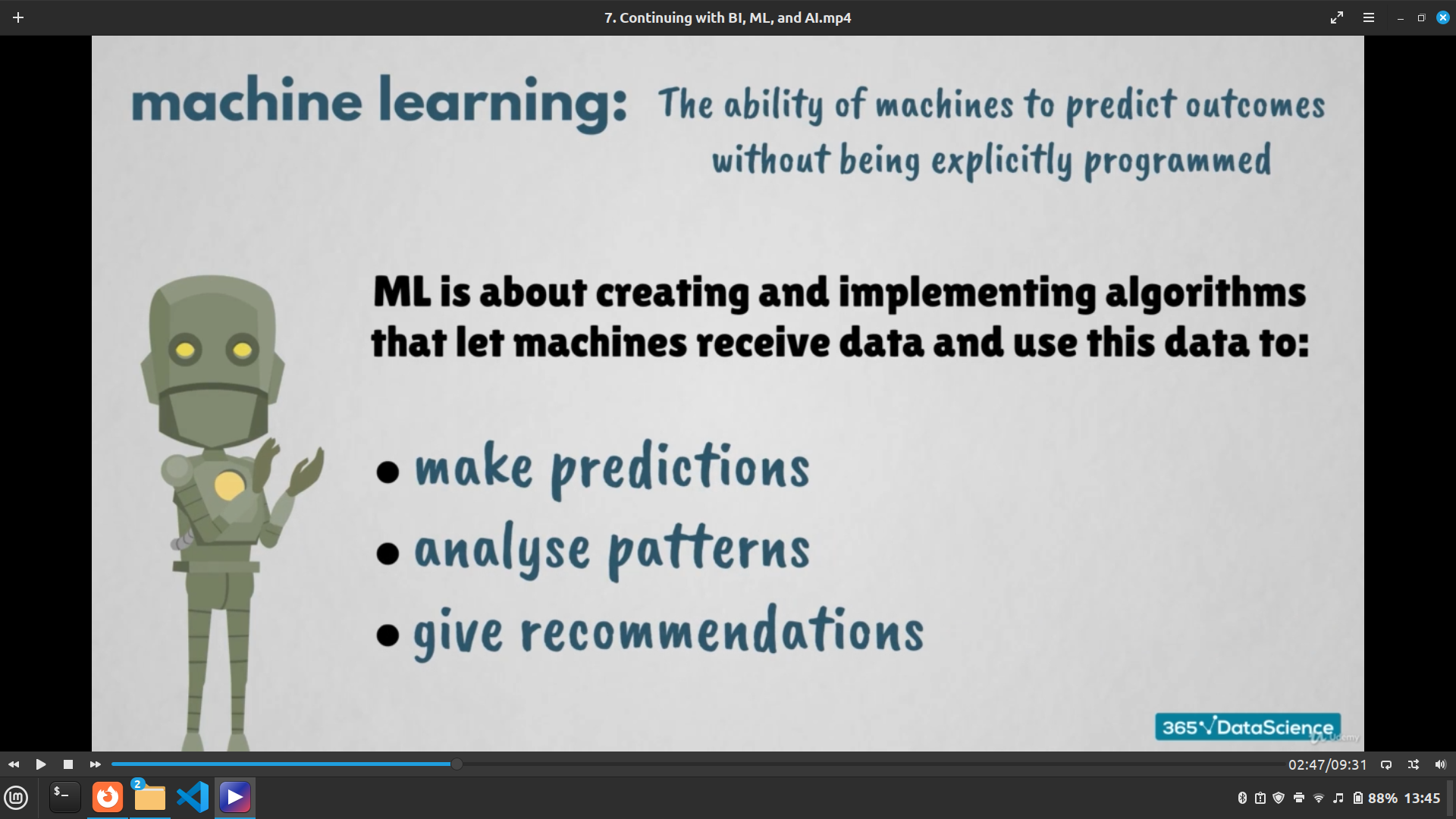 Travail sur environnement Linux. Étude des langages Javascript et Python. Révision des concepts en Statistiques, probabilités, regressions, tests d’hypothèses et outils mathématiques. Étude des Structures de données et algorithmique. Études en Intelligence Artificielle, Machine Learning, Réseaux de neurones, IOT, Arduino…
