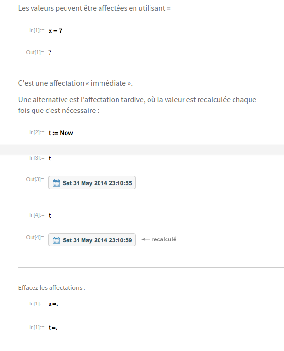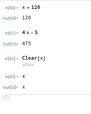 On peut assigner une valeur à une variable, et s’en servir dans des calculs: (et effacer le contenu de la variable):